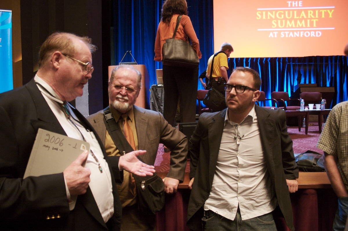 I have returned from the Stanford so-called Summit Conference on "the Singularity." (http://sss.stanford.edu/ ) "The Singularity" is the time when all the trend curves go vertical; it is a time when we can no longer predict the future. One of the trends will be in Artificial Intelligence (AI): a self-aware, self-modifying AI will come into existence, after which it will modify itself to be even smarter. I first heard of this from Vernor Vinge (http://mindstalk.net/vinge/vinge-sing.html) in a serious paper published in 1993; Vernor has also written of these matters in his science fiction. I found it very interesting and very much worth the trip, but then Niven and I got a lot of work done on INFERNO on the drive up, so even if the conference had been a bust it would have been worthwhile to go. I regret that Vernor Vinge had a previous obligation and couldn't drive up with us. Not many in the conference mentioned Vinge: apparently they were trying to be taken seriously and didn't want to be associated with a science fiction author? But then they did invite Niven and me, and had Cory Doctorow on the speaker list, so perhaps that is not it. In any event, there was little about Vinge and not much more about science fiction. John McCarthy speculated that one reason for this conference was to attract the attention of venture capitalists, and they didn't want it to look too wild. I have no opinions on that. While in Stanford I had dinner with Niven, John McCarthy (for the one or two who don't know, the founder of the Stanford Artificial Intelligence Laboratory or SAIL), and my two colleagues/friends/advisors Roland Dobbins and Peter Glaskowsky. I was also able to spend a couple of hours with Roland, Peter, John, and Larry Niven after the conference, and at dinner I sat with Doug Hofstadter, who has since sent me a long letter about his impressions of what went on.