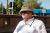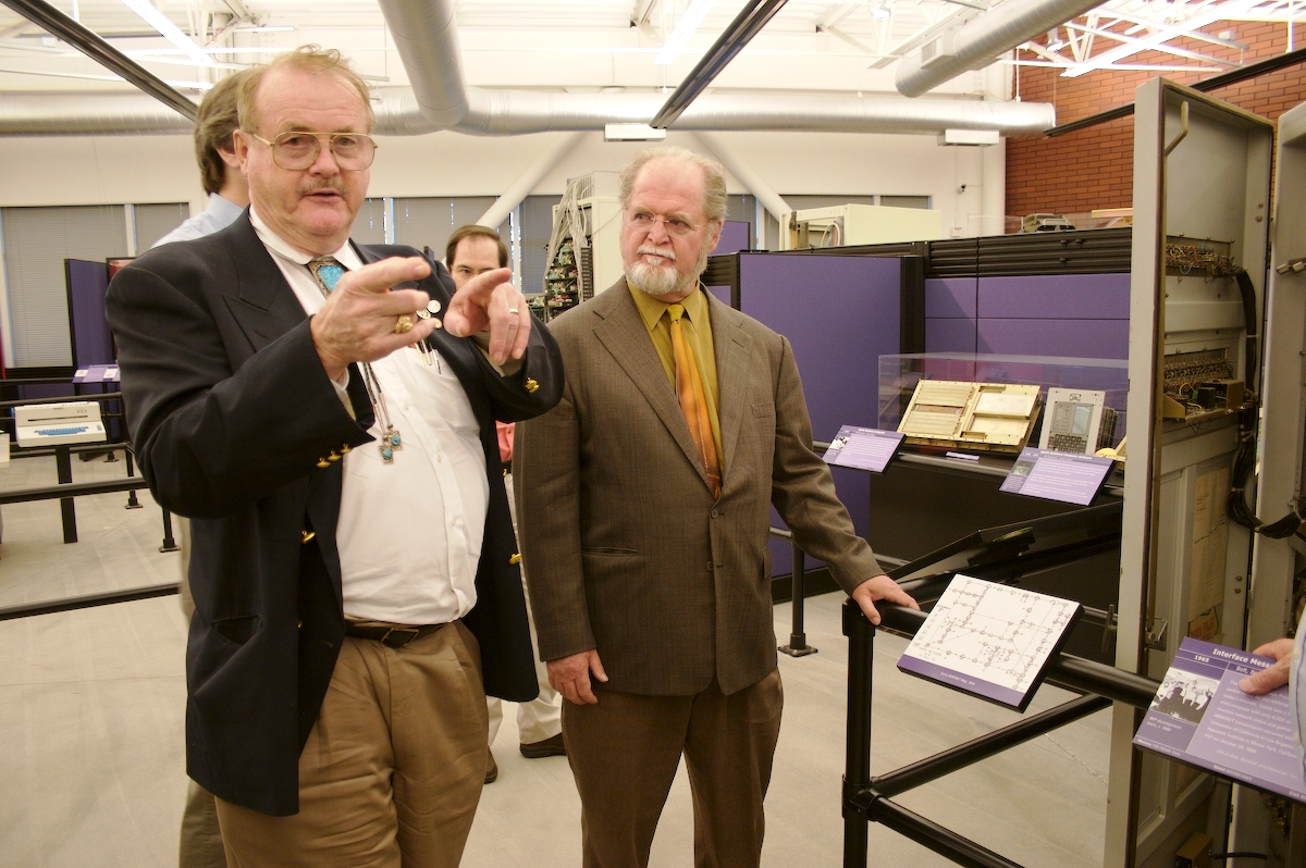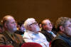 A grab bag of pictures from Sanford. Chris Peterson, me, the audience, John McCarthy at coffee after the event, me explaining the IMP to Niven: we were both on the early ARPA-Net; another shot of me in the Computer Museum (well worth a report on its own); and me in my "Jerusalem hat" which I bought from a Palestinian in Israel during our visit there.