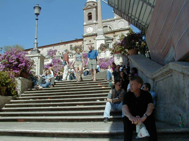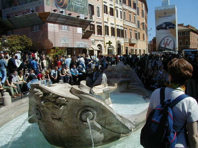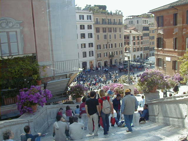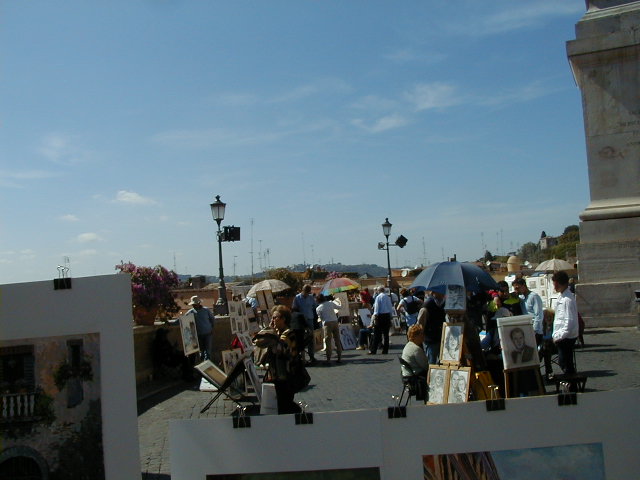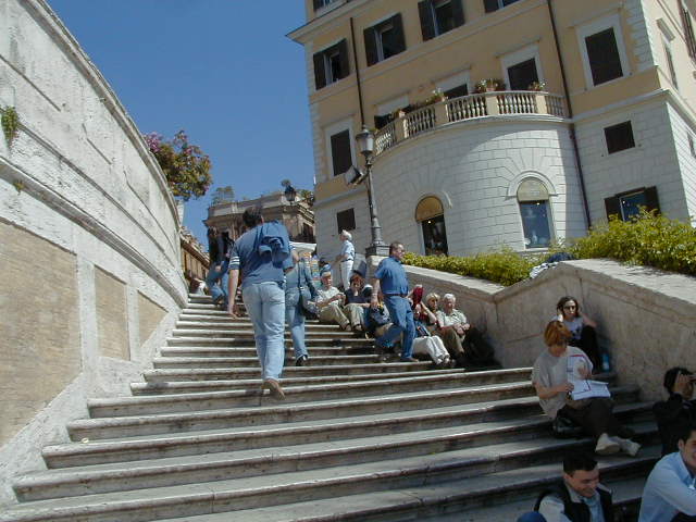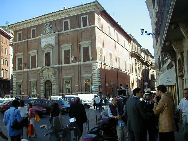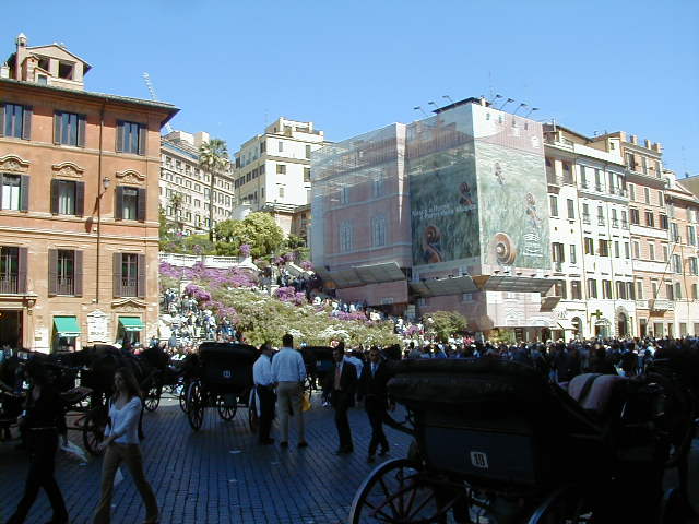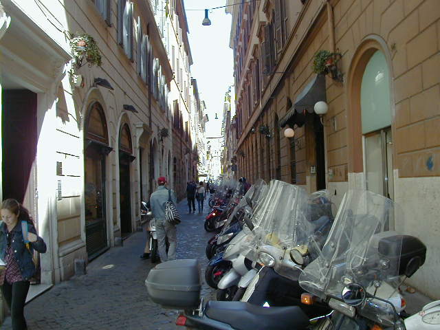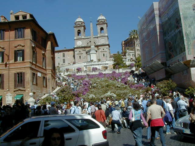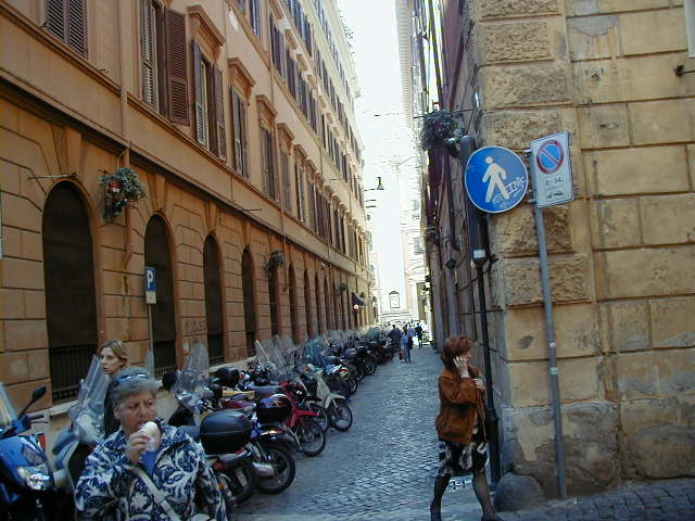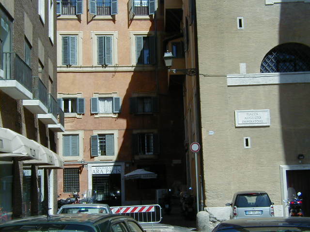 I'm back at the Mausoleum of Augustus, and this is the inscription in as good a photograph as I can take with what I am carrying, and another picture of the ruins of the last known resting place of the man who was master of the world. Looking east from the tomb we see what concerned Rome in the Papal era, and what concerns the city now at the Piazza Augusto. Since they have only recently discovered the Peace Arch I suspect the restaurant named for it is fairly new. I don't know if that's really the original Alfredo's or not. It says it is. Just for orientation, that's looking west toward the Tiber from the Piazza Augusto before we head east toward the Piazza Espagna. The Peace Arch would be visible just to the left of the tomb if it weren't for the Papal era church. Going east is a typical sight, Rome's transportation system. You see women in business suits riding these, although more men of course. Oddly enough I haven't seen any men in business suits on scooters, but perhaps I didn't notice. Roberta says she has. And my first impression of the Spanish Plaza and the Spanish Stairs. We'll see a lot more of this, but the first thing to note is that it's crowded. This is Tourist Rome with a vengeance. There's a fountain in there somewhere. Moving across the square, we see a column now shrouded in scaffolding. Looking back we see American Express, an important location in Rome. You can get your mail delivered there. Inside that scaffolding is the column erected to celebrate the proclamation of the Immaculate Conception. That building beyond the column is the Jesuit College for the Propagation of the Faith, a very important building housing important people of the Counter Reformation. The building was designed to look important because serious work was being done there. Now, the column repairs are sponsored, or at least someone has sold advertising on the scaffolding. When the Immaculate Conception was proclaimed there was theological controversy, and it was considered important. Today it's a vehicle to advertise cars, and the only thing important is the location. More views of the carefully designed College for the Propagation of the Faith. The entrance was designed to be impressive, to awe you with the serious purpose of this building and the people in it. Alas, the square behind it was built up, so that you can't really see the entrance in all its glory. And it might be thought more serious if there were not a clothing store rented out at the corner. But then we see the picture worth 10,000 words when it comes to explaining what is happening in the culture wars: I suspect comment is superfluous. A police captain in earnest discussion. The Sacred College is beyond him. And now we move back toward the Spanish Stairs, and on to the church at the top. This is a working parish church. The plaza in front of it has wonderful views, and also serves as a kind of art gallery. We are now at an upper level and moving north toward the trees we saw from Piazza del Poppolo the first day. The Villa Borgheze is ahead.