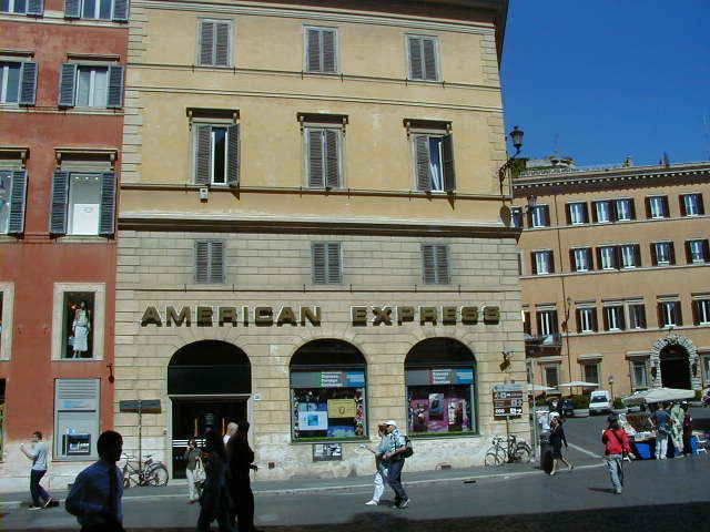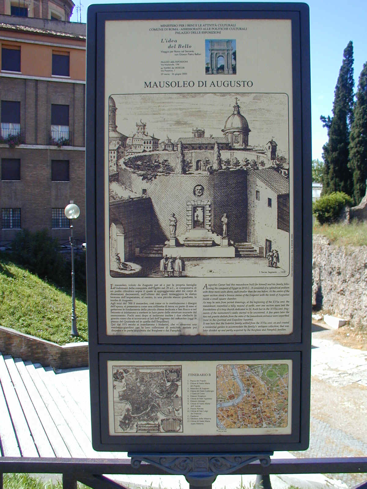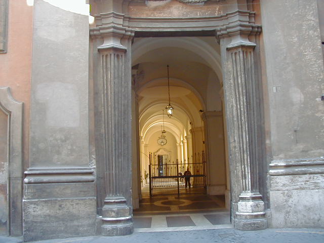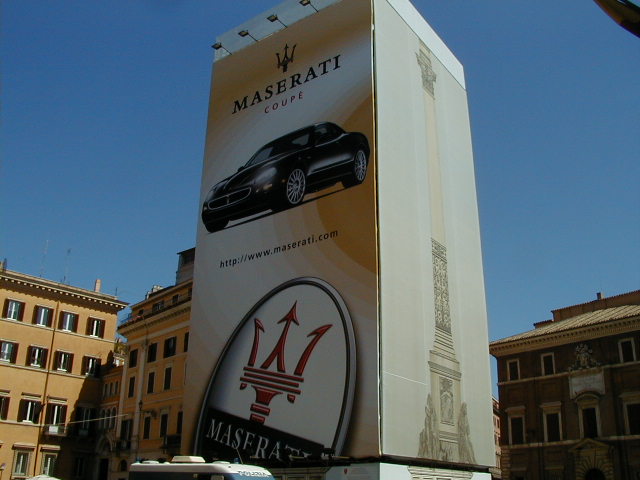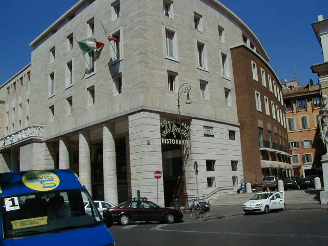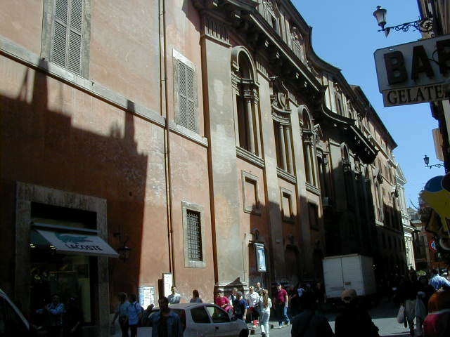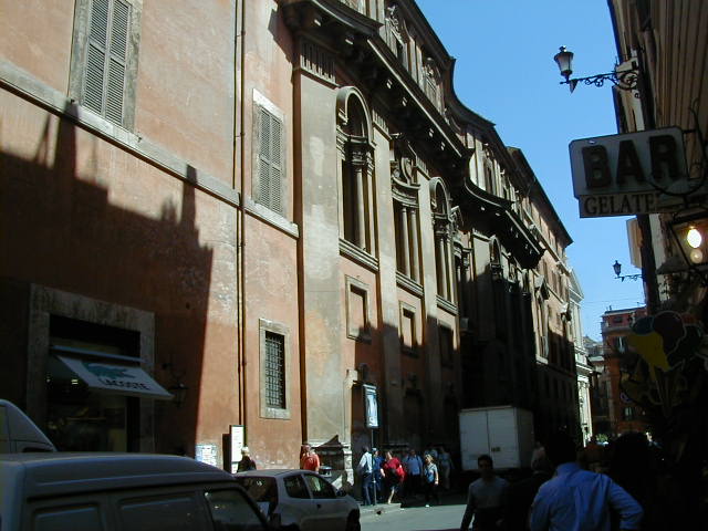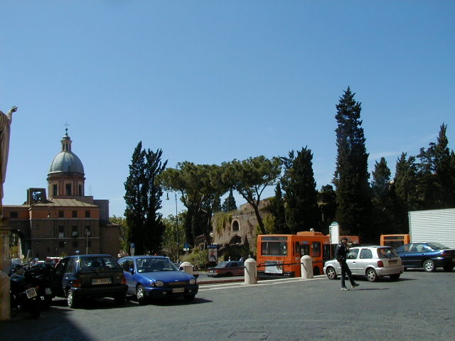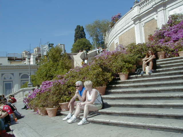 I'm back at the Mausoleum of Augustus, and this is the inscription in as good a photograph as I can take with what I am carrying, and another picture of the ruins of the last known resting place of the man who was master of the world. Looking east from the tomb we see what concerned Rome in the Papal era, and what concerns the city now at the Piazza Augusto. Since they have only recently discovered the Peace Arch I suspect the restaurant named for it is fairly new. I don't know if that's really the original Alfredo's or not. It says it is. Just for orientation, that's looking west toward the Tiber from the Piazza Augusto before we head east toward the Piazza Espagna. The Peace Arch would be visible just to the left of the tomb if it weren't for the Papal era church. Going east is a typical sight, Rome's transportation system. You see women in business suits riding these, although more men of course. Oddly enough I haven't seen any men in business suits on scooters, but perhaps I didn't notice. Roberta says she has. And my first impression of the Spanish Plaza and the Spanish Stairs. We'll see a lot more of this, but the first thing to note is that it's crowded. This is Tourist Rome with a vengeance. There's a fountain in there somewhere. Moving across the square, we see a column now shrouded in scaffolding. Looking back we see American Express, an important location in Rome. You can get your mail delivered there. Inside that scaffolding is the column erected to celebrate the proclamation of the Immaculate Conception. That building beyond the column is the Jesuit College for the Propagation of the Faith, a very important building housing important people of the Counter Reformation. The building was designed to look important because serious work was being done there. Now, the column repairs are sponsored, or at least someone has sold advertising on the scaffolding. When the Immaculate Conception was proclaimed there was theological controversy, and it was considered important. Today it's a vehicle to advertise cars, and the only thing important is the location. More views of the carefully designed College for the Propagation of the Faith. The entrance was designed to be impressive, to awe you with the serious purpose of this building and the people in it. Alas, the square behind it was built up, so that you can't really see the entrance in all its glory. And it might be thought more serious if there were not a clothing store rented out at the corner. But then we see the picture worth 10,000 words when it comes to explaining what is happening in the culture wars: I suspect comment is superfluous. A police captain in earnest discussion. The Sacred College is beyond him. And now we move back toward the Spanish Stairs, and on to the church at the top. This is a working parish church. The plaza in front of it has wonderful views, and also serves as a kind of art gallery. We are now at an upper level and moving north toward the trees we saw from Piazza del Poppolo the first day. The Villa Borgheze is ahead.