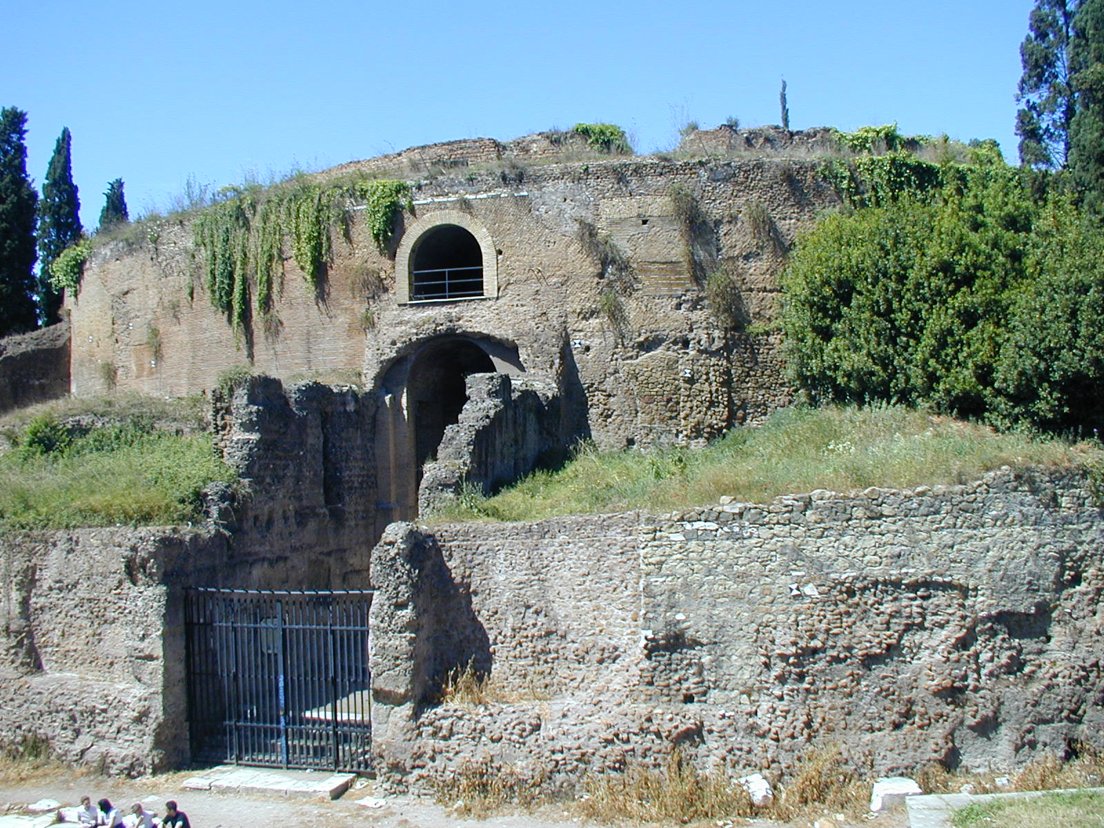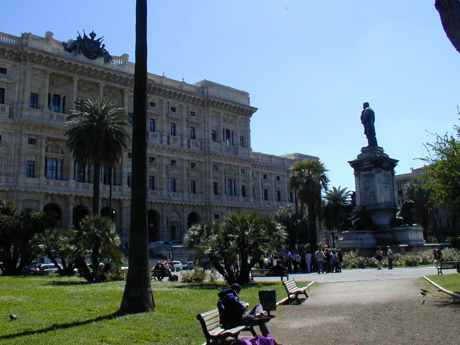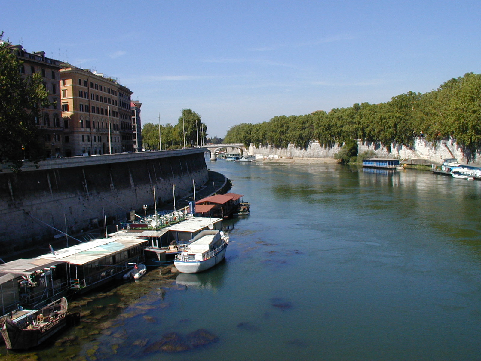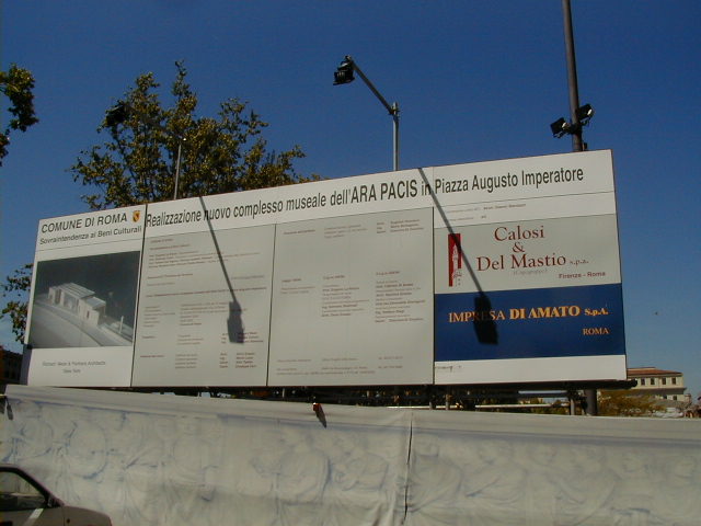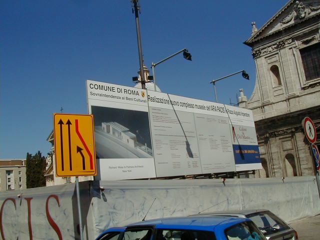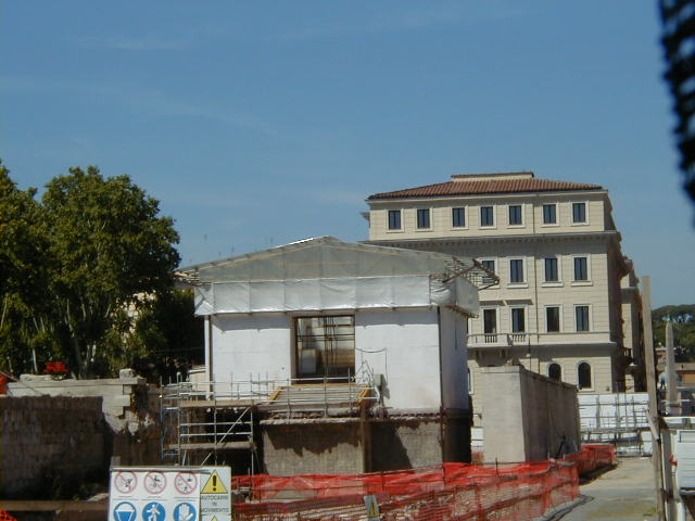 I went out about 2 PM. This is the palace of justice, built around the turn of the century, and that's Cavour, the cabinet minister of the royal unification who made modern Italy possible. Everyone says they hate the palace of justice. At least all the intellectuals say it. The building was popular enough with the people that when it began to settle of its own weight -- that's a lot of granite -- it was hurriedly shored up and put right again. The people don't have the same cultural tastes as their intellectual leaders. Looking up the Tiber from the Cavour bridge. I have come here looking for the Peace Arch of Augustus. And I have found it. As I said in the earlier report, it's under reconstruction. Go past it and
